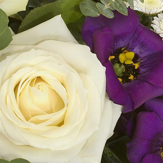 Mauves and creams are the star combination in this aqua pack hand-tied. Roses take the lead with Lisanthus and Chrysanthemums. Great for a Silver wedding gift.