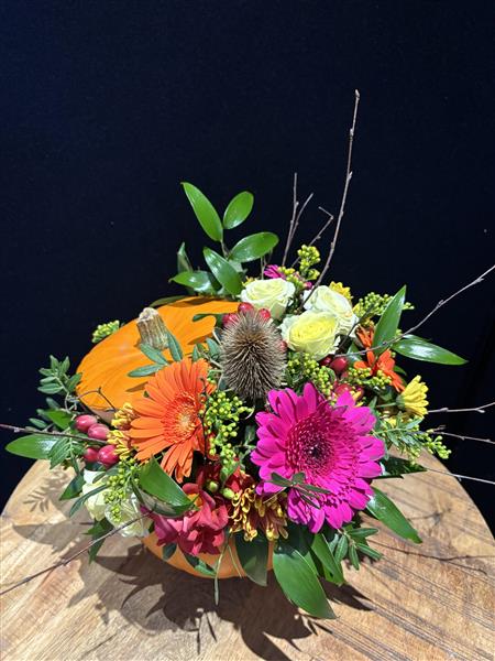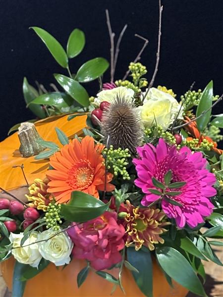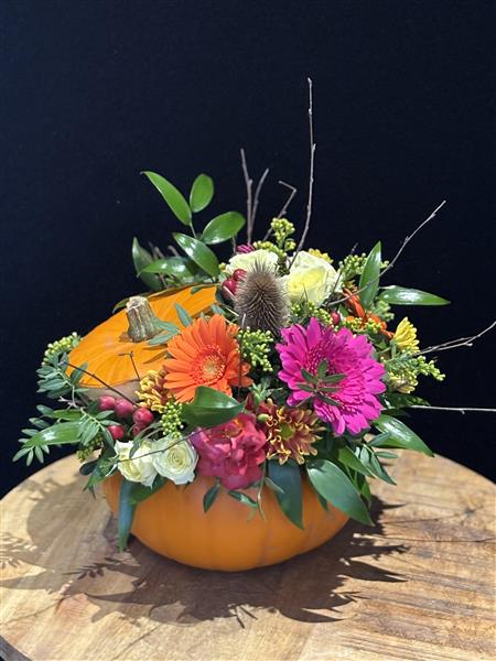 A perfect autumnal gift, these pumpkin arrangements include a lovely seasonal mix of flowers.